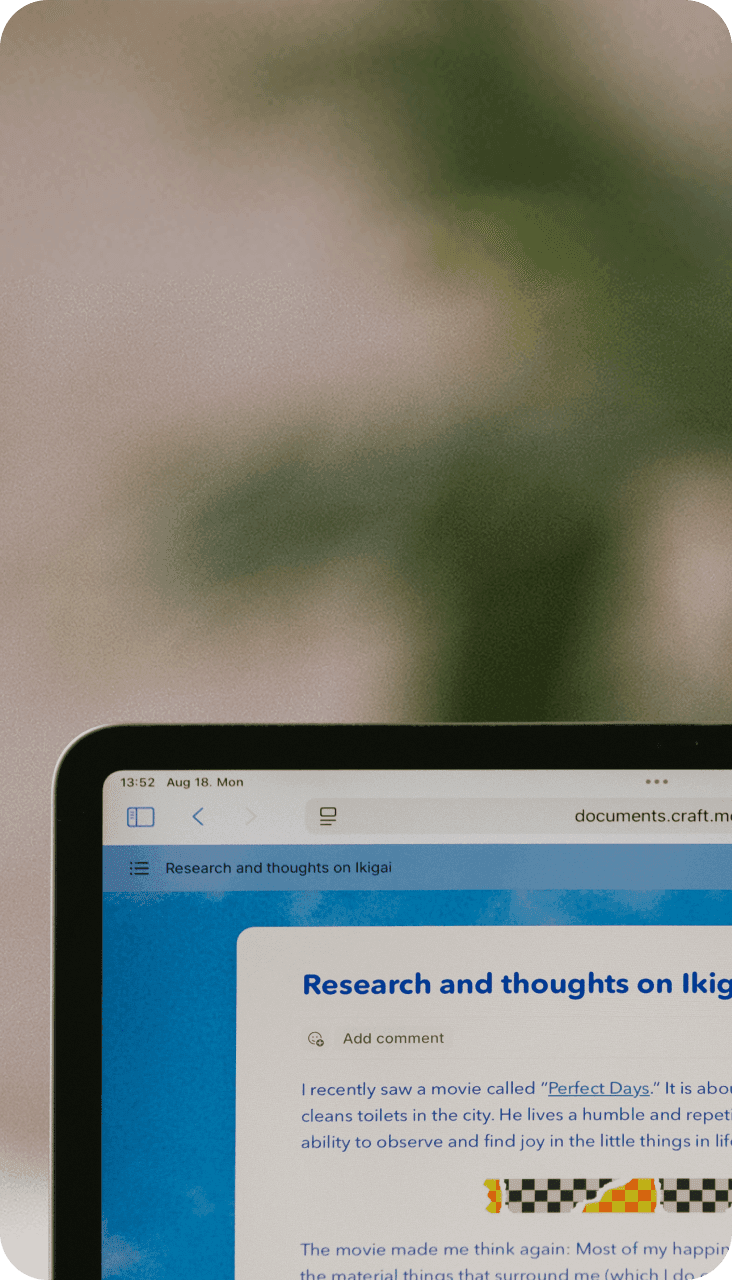 Craft hace que compartir se sienta como parte del proceso al escribir. Publica, colabora o simplemente envía un enlace, todo desde el mismo lugar donde trabajas. Tu documento se mantiene limpio, claro y exactamente como lo diseñaste. Decide si quieres compartir un enlace que se actualice en tiempo real, invitar a comentarios o publicar tu trabajo con un solo clic.